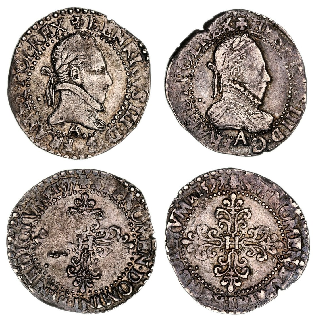 France, Henry III (1574-1589), Quarter-Franc au col plat, 1577 A, Paris, laureate and draped bust right, with plain collar, rev. floriated cross, lys at end, H at centre, 3.45g, 9h (Dupl. 1132), softly struck in parts, with some lustre, bold fine; Quarter-Franc au col gaufré, 1577 A, Paris, laureate and draped bust right, rev. floriated cross, lys at end, H at centre, 3.38g, 9h (Dupl. 1232), toned and mostly well-struck, very fine (2)
