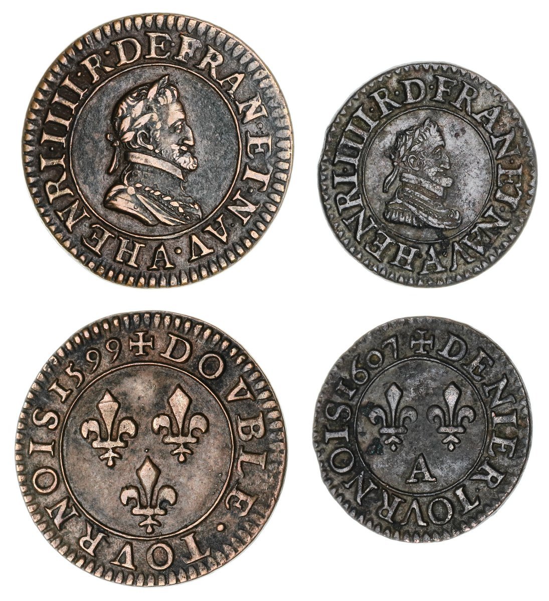 France, Henry IV (1589-1610), Double Tournois of 2-Deniers, 1599 A, Paris, Type II, HENRI . IIII . R . DE . FRAN . ET . NAV ., laureate and cuirassed bust right, rev. + DOVBLE . TOVRNOIS 1599, three lys, 2.92g, 6h (Dupl. 1273; C/4; KM 16.1), with a hint of lustre, good very fine, scarce in such condition; Tournois of 1-Denier, 1607 A, Paris, Type II, . HENRI . IIII . R . D . FRAN . ET . NAV ., laureate and cuirassed bust right, rev. + DENIER . TOVRNOIS 1667 ., two lys, (Dupl. 1274; A/1; KM 15), darkened surfaces, yet pleasing for type, good very fine, scarce (2)