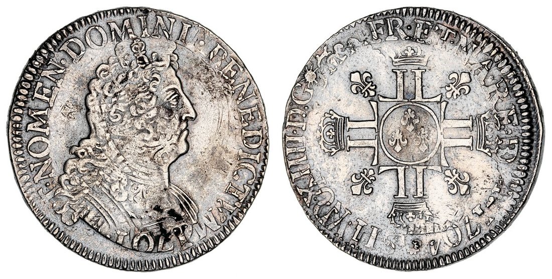 France, Louis XIV (1643-1715) Quarter-Ecu aux huit L, 'reformed flan', 1704, [uncertain mint], cuirassed bust right, rev. cross of eight L's crowned, lys at centre, edge raised lettered, 27.19g, 6h (Gad. 161; KM 352), restruck on opposite sides, and verdigris to obverse, previously cleaned and with patches of retoning, bolder fine