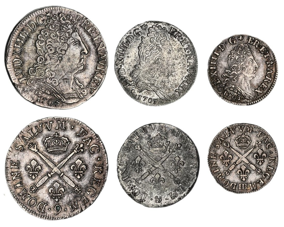 France, Louis XIV (1643-1715), 20-Sols, 1707 9, Rennes, insignia type, cuirassed bust right, rev. sceptres in saltire, crown and lys in angles, edge plain, 6.12g, 6h (Dupl. 1565; KM 376), some adjustment marks to edge and metal flaw below truncation, spots of verdigris, yet with some lustre, very fine; 10-Sols, 1707 &, Aix, insignia type, cuirassed and draped bust right, rev. sceptres in saltire, crown and lys in angles, edge plain, 3.03g, 6h (Dupl. 1566; KM 349.13), scratched and lightly corroded surfaces, about very fine; 5-Sols, 1703 BB, Strasbourg, with insignia, cuirassed and draped bust right, rev. sceptres in saltire, crown and lys in angles, edge plain, 1.46g, 6h (Dupl. 1567; KM 337.4), striking split before date, otherwise toned, good very fine (3)