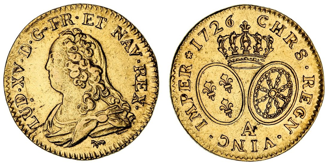 France, Louis XV (1715-1774), Gold Louis d'or, 1726 A, Paris, young cuirassed and draped bust left, rev. crowned oval shields, edge corded, 8.07g, 6h (Gad 340; KM 489.1; Fb. 461), cleaned and suggestion of earlier mounting, about very fine