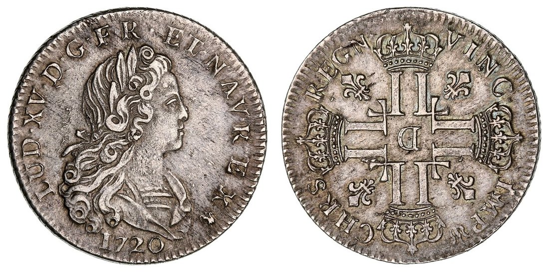 France, Louis XV (1715-1774), Petit Louis d'argent of 3-Livres or 1/3 Ecu, 1720 D, Lyon, young laureate, cuirassed and draped bust right, rev. crowned L's in cruciform, lys in angles, 8.10g, 6h (Dupl. 1664; Gad 305), obverse struck from a lightly rusted die, yet toned and with some lustre to reverse, good very fine