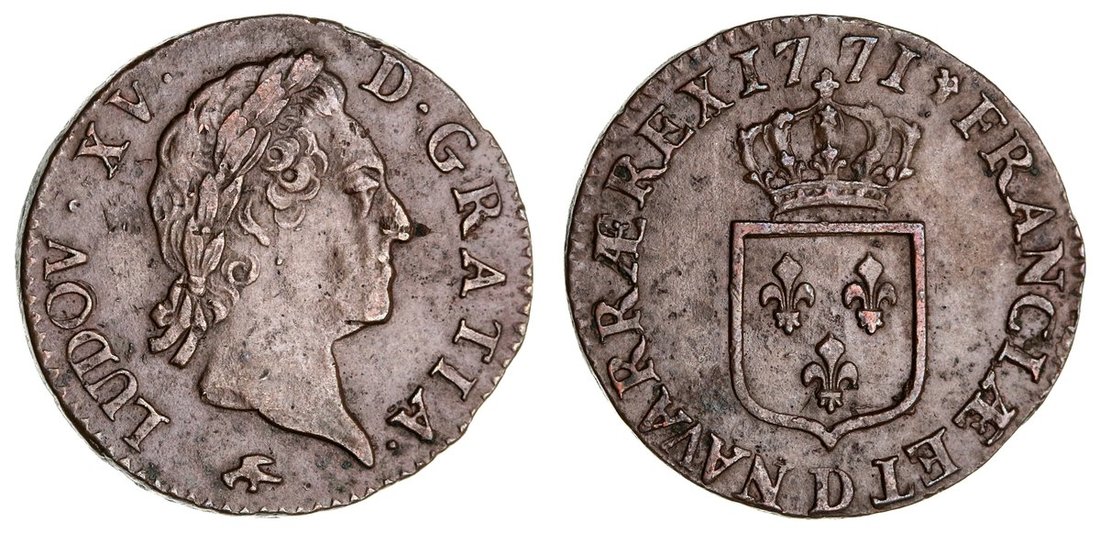 France, Louis XV (1715-1774), 'A La Vieille Tete' Half-Sol, 1771 D, Lyon, older laureate third bust right, rev. crowned shield, edge plain, 6.23g, 6h (Dupl. 1700; KM 544), some surface pitting, otherwise with a pleasing chocolate brown, good very fine