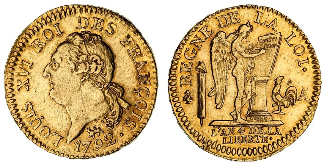 France, Constitution (1791-1792), Gold 24-Livres, 1792 A (AN IV), Paris, bare head left of Louis XVI, rev. angel inscribing the constitution on a tablet, edge raised lettered, 7.65g, 6h (Gad. 61; KM 617.1; Fb. 477), wiped and softness to tops of devices, hairline scratch to reverse, with a hint of red tone, very fine and scarce