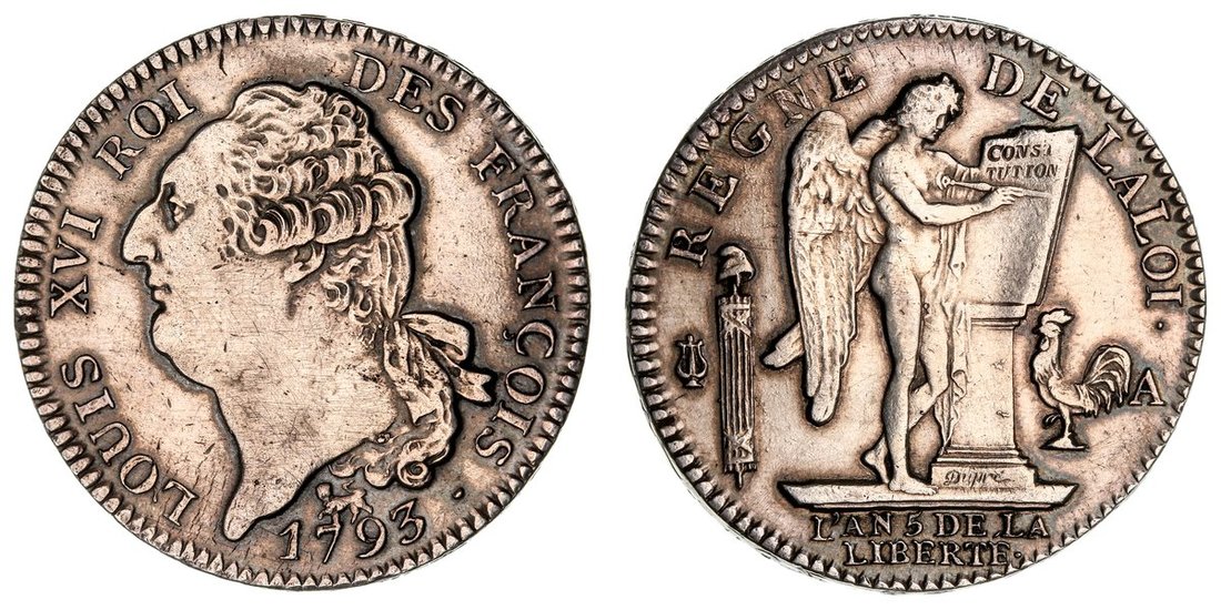 France, Constitution (1791-1792), Ecu, 1793 A, Paris, 'Francois' Type, bare head left of Louis XVI, rev. Genius engraving the Constitution placed on an altar at right, edge raised lettered upwards, 29.36g, 6h (Gad. KM 615.1), wiped and with resulting brushmarks, lightly bagmarked, yet with a darker toning to peripheries, very fine