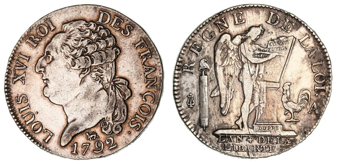 France, Constitution (1791-1792), Half-Ecu, 1792 A, Paris, 'Francois' Type, bare head left of Louis XVI, rev. Genius engraving the Constitution placed on an altar at right, edge raised lettered upwards, 14.57g, 6h (Dupl. 1719; Gad. 43; KM 613.1), cleaned and with adjustment marks to reverse, yet with flashes of toning, about very fine, scarce two-year issue type