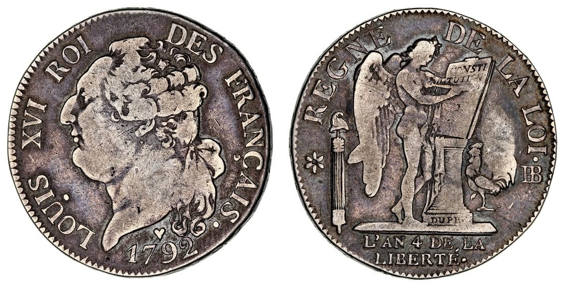 France, Constitution (1791-1792), Half-Ecu of 3-Livres, 1792 BB, Strasbourg, 'Francais' Type, bare head left of Louis XVI, rev. Genius engraving the Constitution placed on an altar at right, edge raised lettered upwards, 14.46g, 6h (Gad. 42; KM 614), rubbed and lightly contact marked, fine and a very scarce issue of the reign of Louis XVI