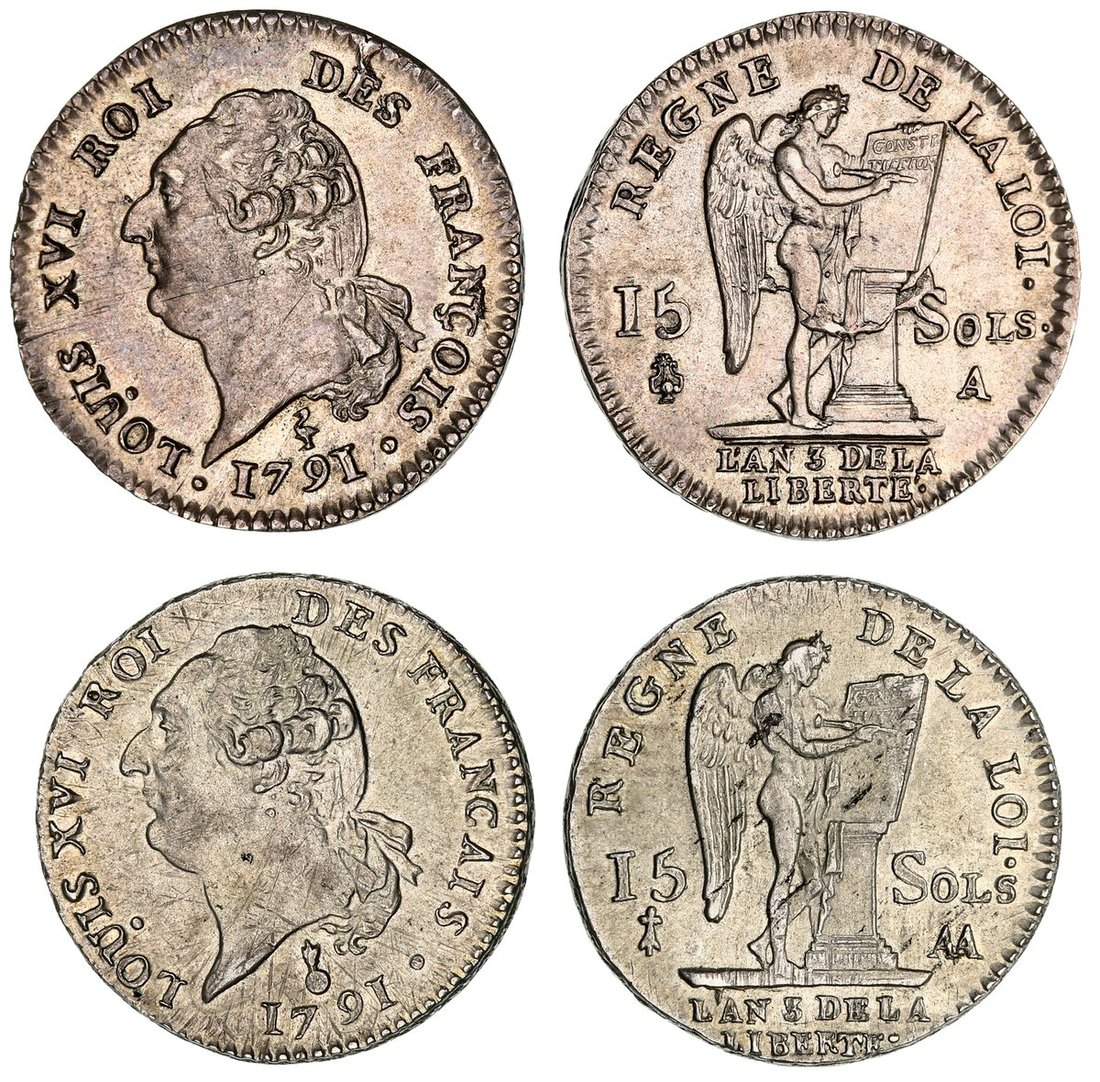 France, Constitution (1791-1792), 15-Sols, 1791 AA, Metz, 'Francais' Type, bare head left, rev. Genius engraving the Constitution placed on an altar at right, engrailed edge, 5.07g, 6h (Gad. 35; KM 605.1), scratched and worn, very fine; 15-Sols, 1791 A, Paris, 'Francais' Type, with heron, much as before, edge engrailed, 5.01g, 6h (Gad. 36; KM 604.1), some hairline scratches, lustrous, good very fine (2)