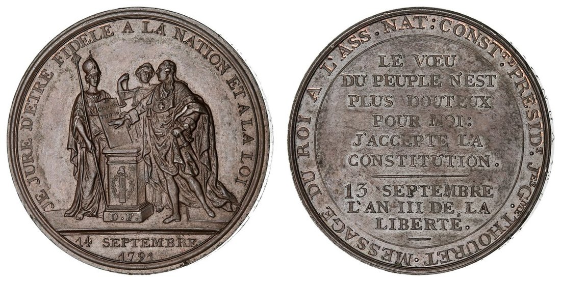 France, Constitution (1791-1792), Acceptance of the Constitution by Louis XVI, AE Medal, 1791, Soho Mint, by Augustin Dupré, Louis standing left, placing hand upon constitution set upon altar, behind standing figures of Minerva and Aequitas, rev. legend in 9 lines, edge incuse lettered downwards, 25.00g, 12h (Maz. 244), lustrous and with pleasing dark brown surfaces, extremely fine