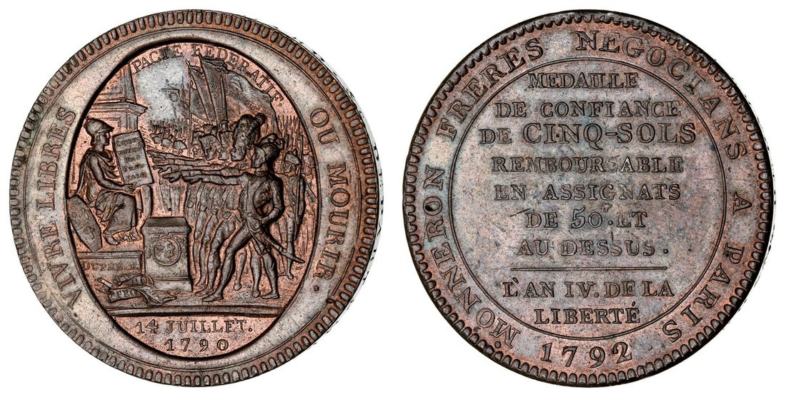 France, Constitution (1791-1792), Monneron 5-Sols, 1792 (AN IV), Soho Mint, allegiance scene, rev. legend in 9 lines, edge incuse lettered downwards, 29.85g, 6h (Maz. 145; KM Tn31; R55-3), couple of bagmarks, otherwise with a pleasing mint red to light brown surfaces, good extremely fine