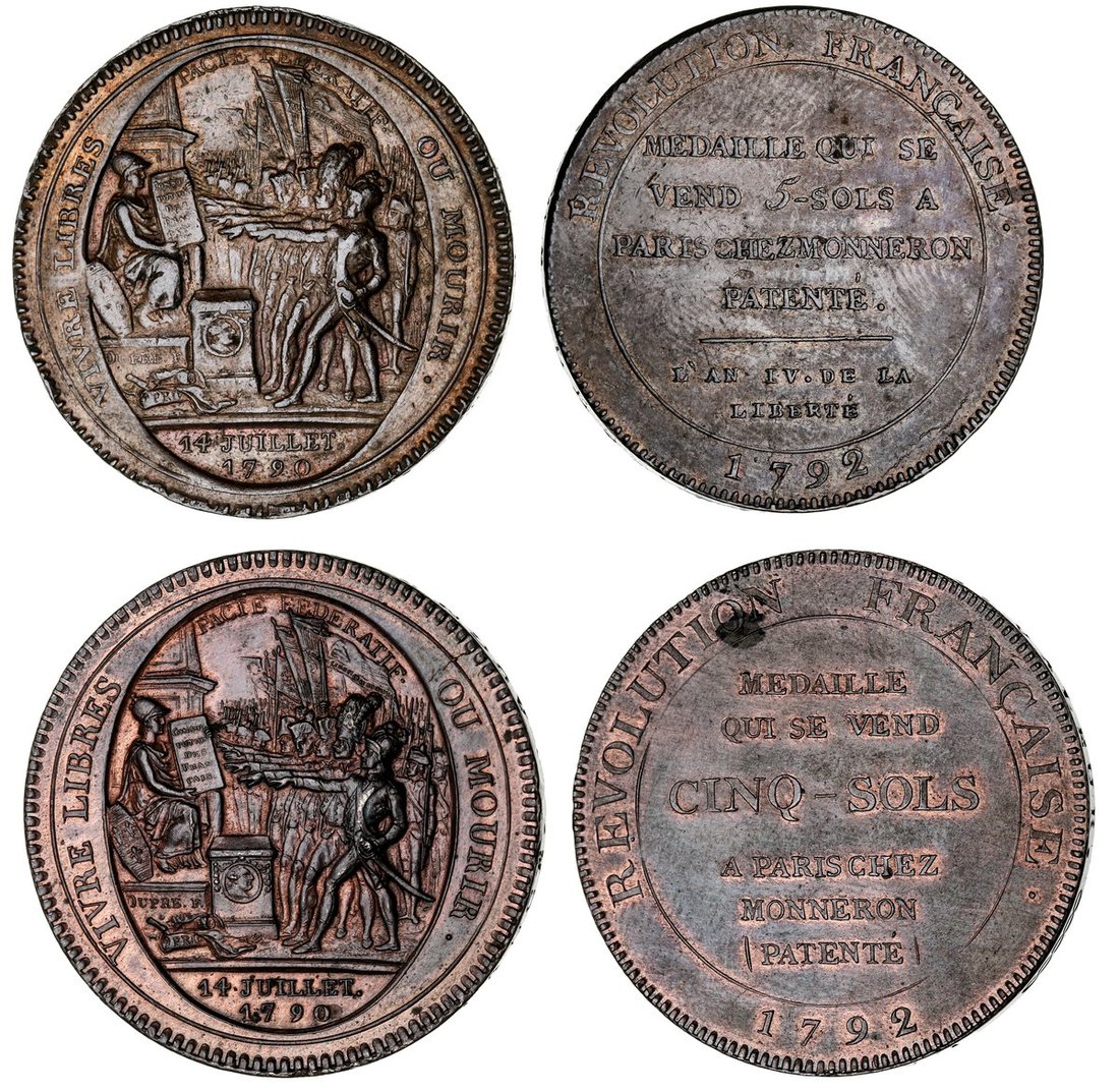 France, Constitution (1791-1792), Monneron 5-Sols, 1792 (AN IV), Soho Mint, allegiance scene, rev. legend in 6 lines, edge incuse lettered downwards, 24.56g, 6h (Maz. 145; KM Tn31; VG 294; R55-4), soft to tops of devices and signs of wear, otherwise with flashes of red, very fine; another, Monneron 5-Sols, 1792 (AN IV), Soho Mint, allegiance scene, rev. legend in 6 lines, edge incuse lettered upwards, 26.97g, 12h (Maz. 145; KM Tn31; R55-5), spall patch of staining to reverse, yet with pleasing flashes of red, about extremely fine (2)