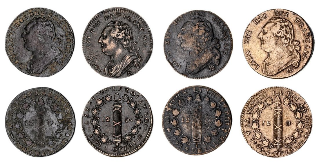 France, Constitution (1791-1792), 12-Deniers (4), 1791 AA, Metz; 1792 Q, Perpignan, 'Francois Type, draped bust left of Louis XVI, rev. fasces topped with a Phrygian cap between two oak branches, edges plain, 12.23g, 7h; 10.81g, 5h (Dupl. 1723; KM 600), stress crack in first flan, worn, fine; also 1792 BB (2), Strasbourg, 'Francais' Type, much as before, edges plain, 16.80g, 7h; 13.05g, 8h (Dupl. 1723 var.; KM 601), one struck on a thicker planchet 'flan lourd', light wear, fine or slightly better (4)