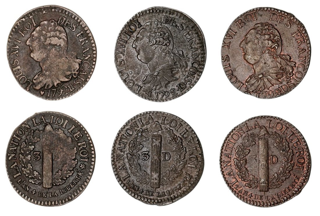 France, Constitution (1791-1792), 3-Deniers (3), 1792 D (2), Lyon, "Francois' Type, draped bust left of Louis XVI, rev. pole topped by a Phrygian cap and accosted by 3 and D between two oak branches, edges plain, 2.99g, 7h; 3.15g, 7h (Dupl. 1725; KM 608.1), slightly off-centre striking, otherwise very fine or better, with some underlying lustre; and, 1792 BB, Strasbourg, 'Francais' Type, much as before, edge plain, 3.18g, 7h (Dupl. 1725 var.; KM 609), light wear, good fine (3)