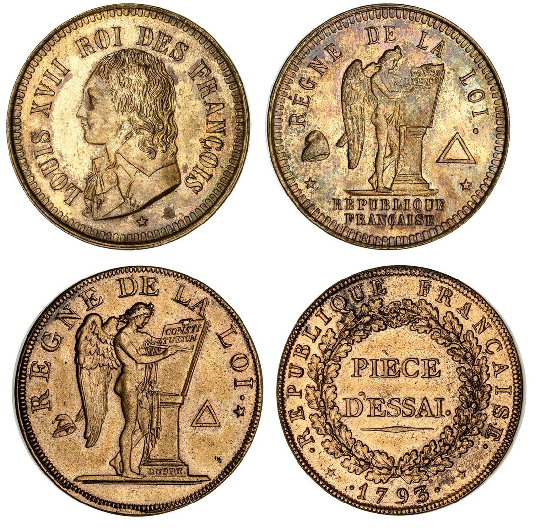 France, Constitution (1791-1792), Essai Pattern Brass 1-Decime, undated, draped bust of young Louis XVII left, star below, rev. angel inscribing legal tablet pileus over star to left and triangle over star to right, edge plain, 9.46g, 6h (Maz. 394 var.), patchy toning to lustrous fields, extremely fine; Essai Pattern Module 2-Sols, 1793, angel inscribing legal tablet pileus over star to left and triangle over star to right, rev. value in wreath, edge plain, 18.46g, 12h (Gad. 33; Maz. 337), excess metal to edge, lustrous, about extremely fine (2)