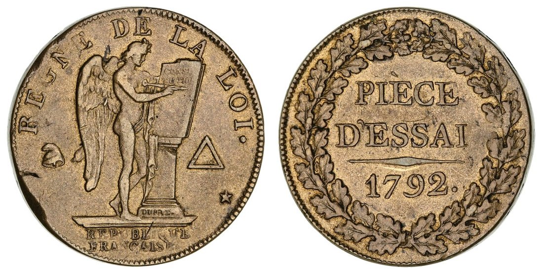 France, National Convention (1792-1795), Essai Pattern Copper Sol, 1792, by Dupre, Genius of Liberty engraving the CONSTITUTION on a cippus, rev. value in wreath, edge plain, 10.92g, 12h (Gad. 20), some edge bruising and light wear to surfaces, very fine