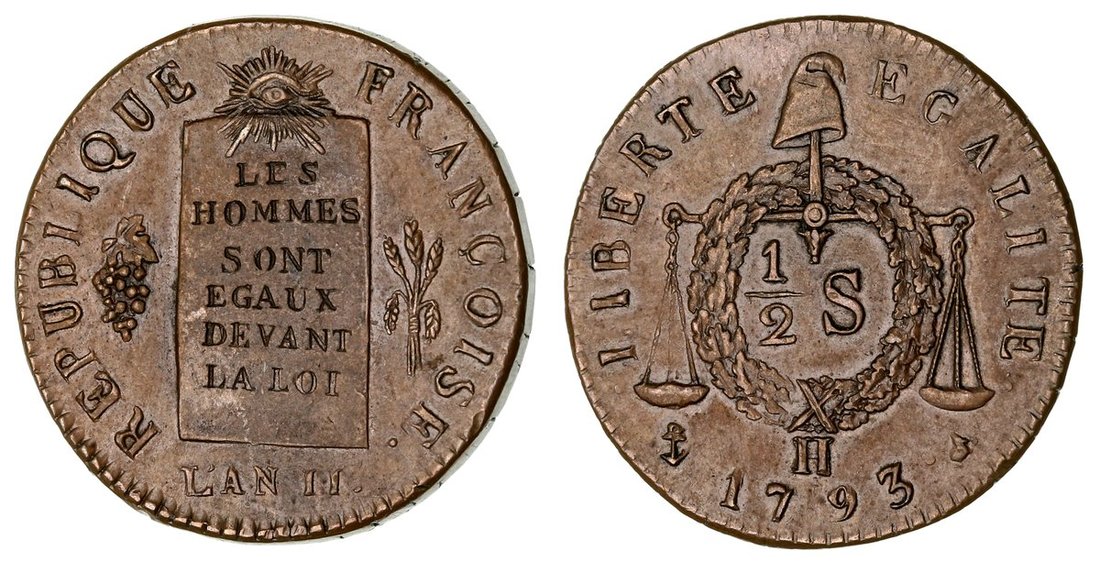 France, National Convention (1792-1795), Copper Restrike Half-Sol, AN II H (1793), struck c. 1848, La Rochelle, inscribed tablet surmounted by radiant eye, grape bunch to left and wheat ear to right, L'AN II in exergue, rev. scales surmounted by cap of Liberty and wreath, denomination within, anchor and jug below left and right dish, date and mintmark in exergue, edge plain, 6.74g, 6h (Gad. 10; KM 618.1), some edge stress, splendid brown toning, extremely fine