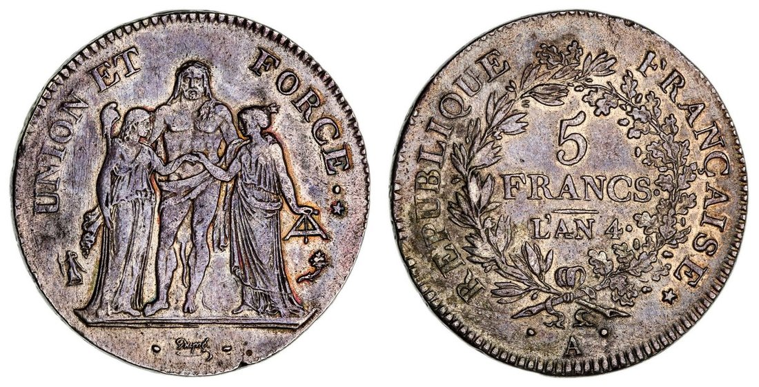 France, Directory (1795-1799), 5-Francs, AN 4 A, Paris, Hercules standing facing, resting hands on shoulders of Liberty, to left, who holds a rod surmounted by pileus, and Equality, to right, who holds a level, both clasping hands in centre, rev. value in wreath, edge incuse lettered downwards, 24.77g, 6h (Gad. 563; KM 639; F. 288/2), very small edge crack at 6 o'clock, evidence of prior cleaning, toned with iridescence, bold fine