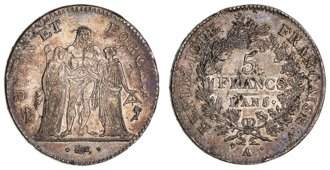 France, Directory (1795-1799), 5-Francs, AN 5 A, Paris, Hercules standing facing, resting hands on shoulders of Liberty, to left, who holds a rod surmounted by pileus, and Equality, to right, who holds a level, both clasping hands in centre, rev. denomination and date within wreath, mintmark below, edge lettered, 25.03g, 6h (Gad. 563; KM 639; Fr. 295/2), reverse deposits, toned, about very fine