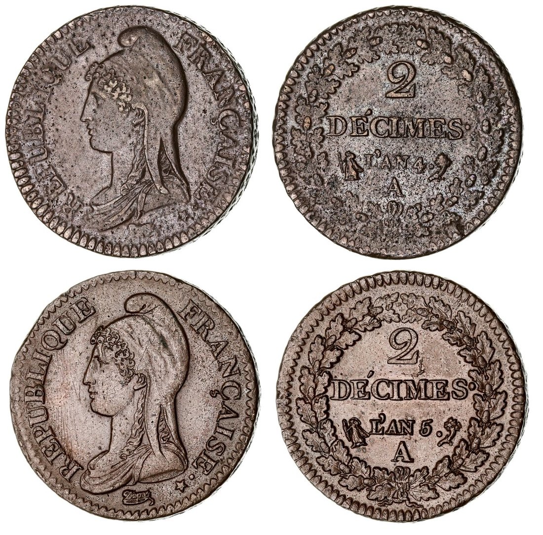 France, Directory (1795-1799), 2-Decimes AN 4 A, Paris, draped bust of Liberty left, wearing Phrygian cap, rev. value in wreath, edge reticulated, 20.12g, 6h (Gad. 300; KM 638; Fr. 145/1), porosity, even toning, very fine; 2-Decomes, AN 5 A, as before, edge reticulated, 18.74g, 6h (Gad. 300; KM 638; Fr. 145/5), scratched before portrait and die rust marks to reverse, a crisp example, about extremely fine (2)