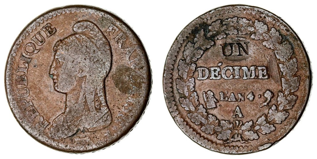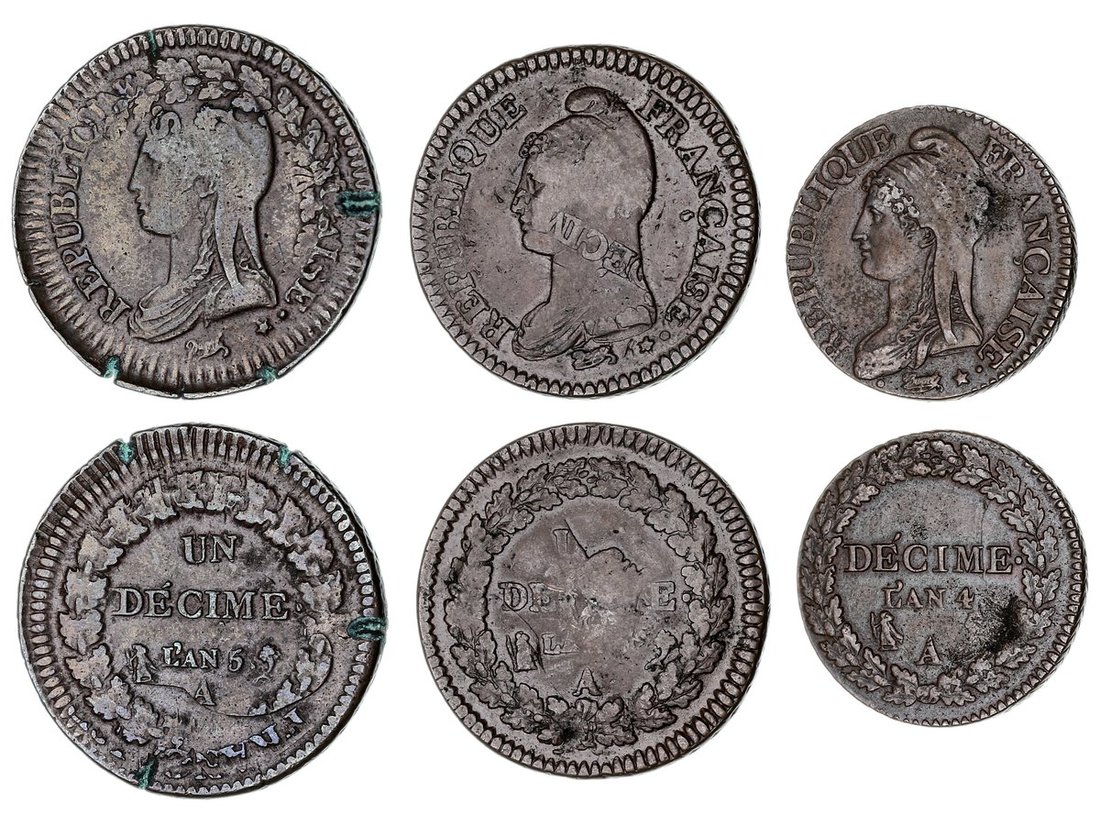 France, Directory (1795-1799), 1-Decime, AN 4 A, Paris, Small Flan, capped bust left, rev. value in wreath, edge chevron milled, 9.49g, 6h (Gad.184; KM 636), pitted flan flaw to both sides, strict very fine; 1-Decime, AN [?] A, Paris, struck over 2-Decime, Large Flan, as before, edge engrailed, 18.79g, 6h (Gad. 185), double struck, fine; 1-Decime, AN 4 A, Paris, struck over 2-Decimes, Large Flan, as before, edge engrailed, 19.25g, 6h (Gad. 186), fair; 1-Decime, AN 5 A, Paris, struck over 2-Decime, Large Flan, as before, edge engrailed, 19.30g, 6h (Gad. 185), double-struck to reverse, file marked to edges and with resulting verdigris, fine; 1-Decime, AN 5 A, Paris, High Module, as before, edge plain, 20.52g, 6h (Gad. 187), pitted otherwise very fine (5)