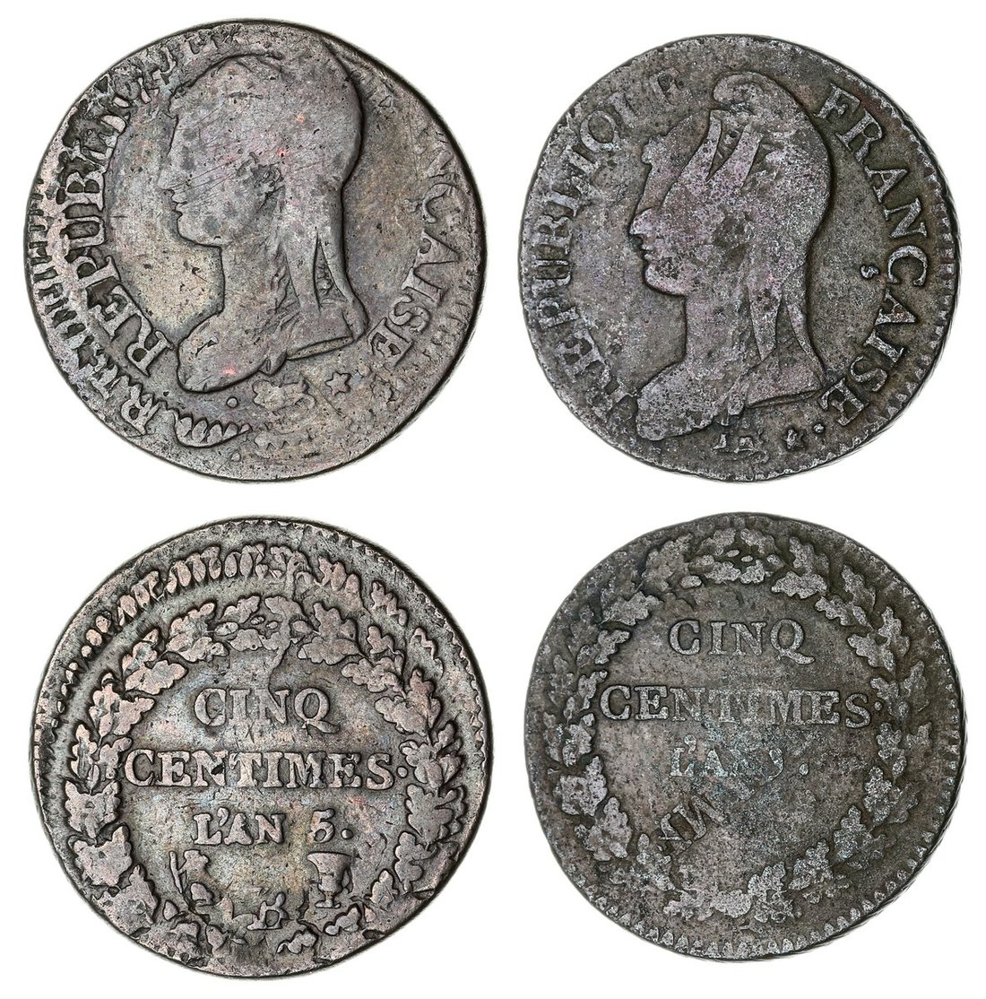 France, Directory (1795-1799), Overstruck 5-Centimes, AN [?], struck on 1-Decime, capped bust left, rev. value in wreath, edge chevron milled, 10.06g, 6h (Gad. 125; F.114), lightly pitted surfaces, the undertype visible to both obverse and reverse, fine, an ever-popular error type; another Overstruck 5-Centimes, AN 5 (1796) B, Rouen, much as before, edge chevron milled, 9.71g, 6h (Gad. 125; F.114/4), double-struck, mostly flat yet toned, fair, an ever-popular error type (2)