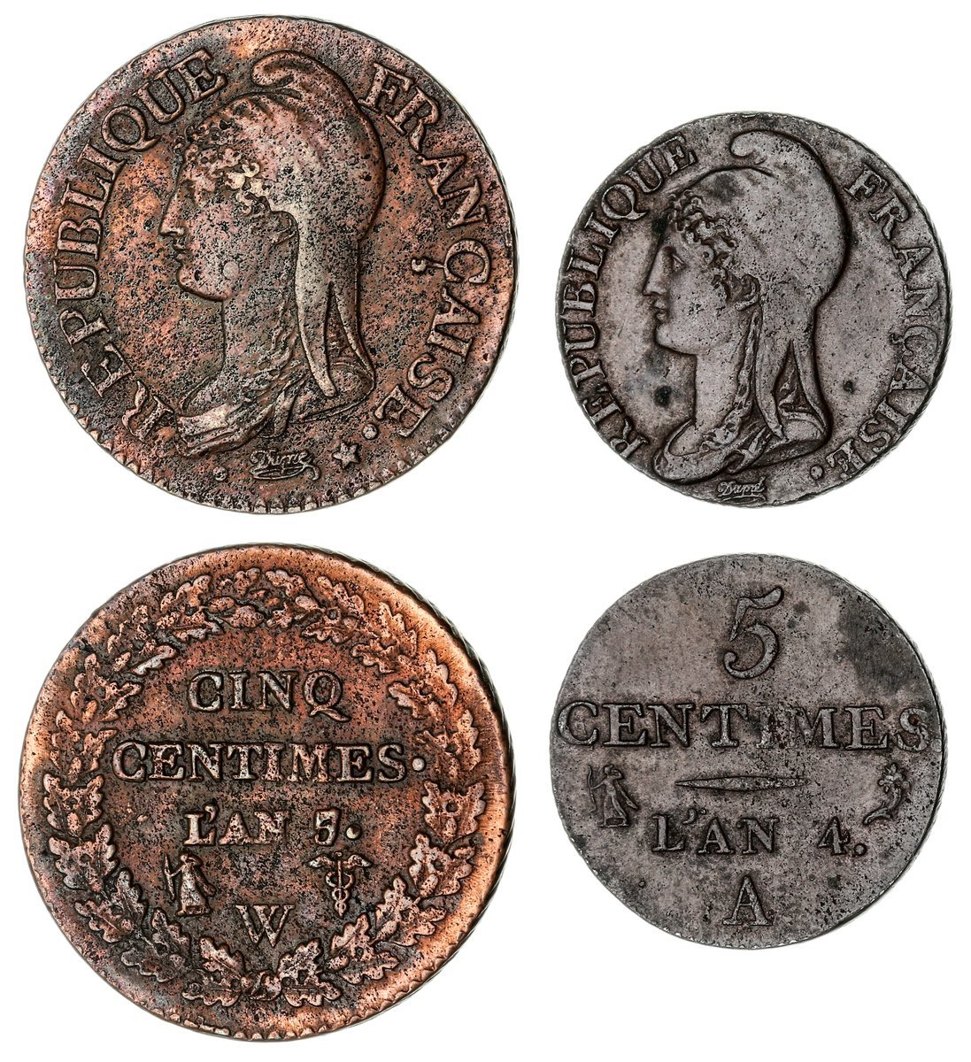 France, Directory (1795-1799), 5-Centimes, AN 7 over 5 (1798), W, Lille, capped bust left, rev. value in wreath, edge obliquely milled, 10.41g, 6h (Gad. 126; F. 115/37), pitted, very fine, very scarce overdate; 5-Centimes, AN 4 A (1795), Paris, 'Small Flan', capped bust left, rev. value, edge obliquely milled, 4.75g, 6h (Gad. 124; F.113/1), lightly pitted, with a uniform dark brown tone, very fine (2)