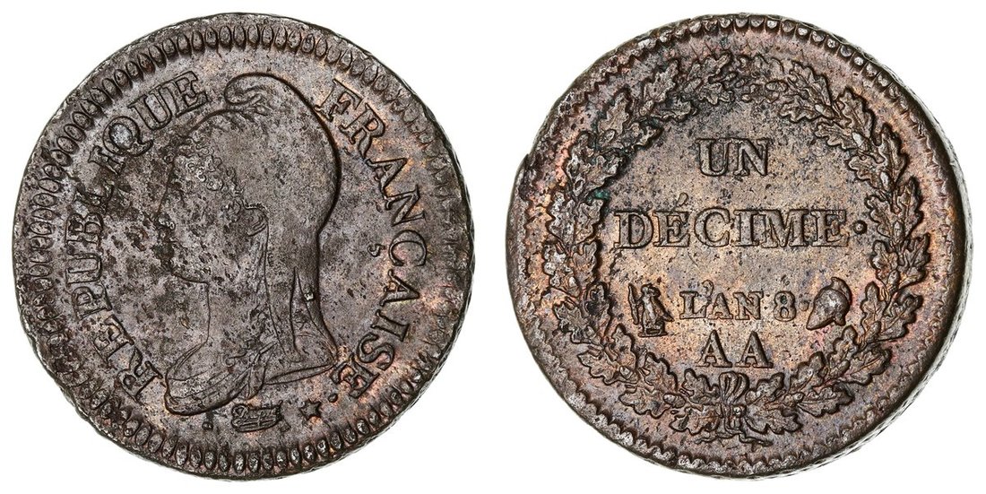 France, Consulate (1799-1804), Hybrid, 5 Centimes / 1 Decime, 'grand module', L'an 8/1799-AA, Metz, draped bust of Liberty left, wearing Phrygian cap, signature and star below, rev. denomination, year and mintmarks within wreath, edge reticulated, 19.66g, 6h (Gad. 126/187; KM 640/644; Fr. 115/129), spot of verdigris to reverse, wear, good fine; a rare and interesting hybrid of the five Centime obverse and one Decime reverse and edge, rare and interesting