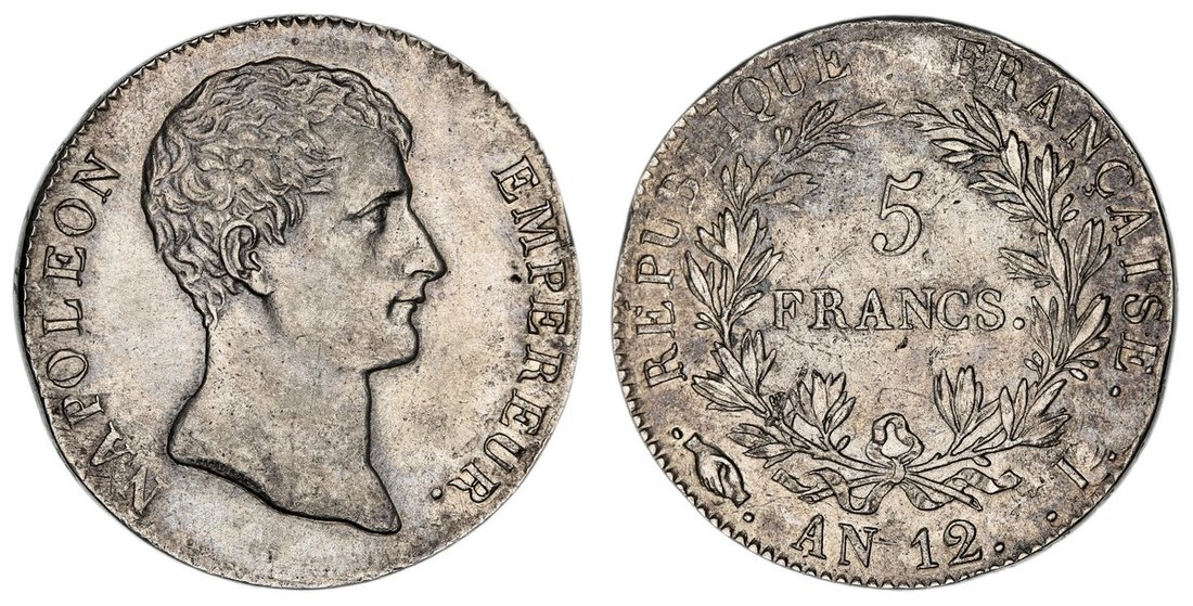 France, Napoleon I, Premier Consul (1799-1804), Transitional Type, 5-Francs, AN 12 I (1803), Limoges, bare head right, rev. value in wreath, edge incuse lettered downwards, 24.48g, 6h (Gad. 579; KM 660.7), cleaned and light pitting in fields, yet subsequently retoned, near very fine
