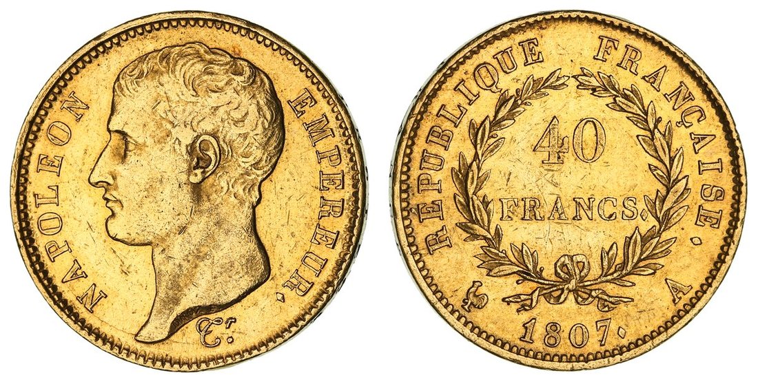 France, First Empire, Napoleon I (1804-1814), Gold 40-Francs, 1807 A, Paris, laureate bust left, rev. value in wreath, eight olives, incuse lettered edge downwards, 12.87g, 6h (Gad. 1082a; KM A688.1; Fb. 481), wiped and lightly contact marked, yet some lustre to reverse, very fine and a one year of issue type, one-year of issue type