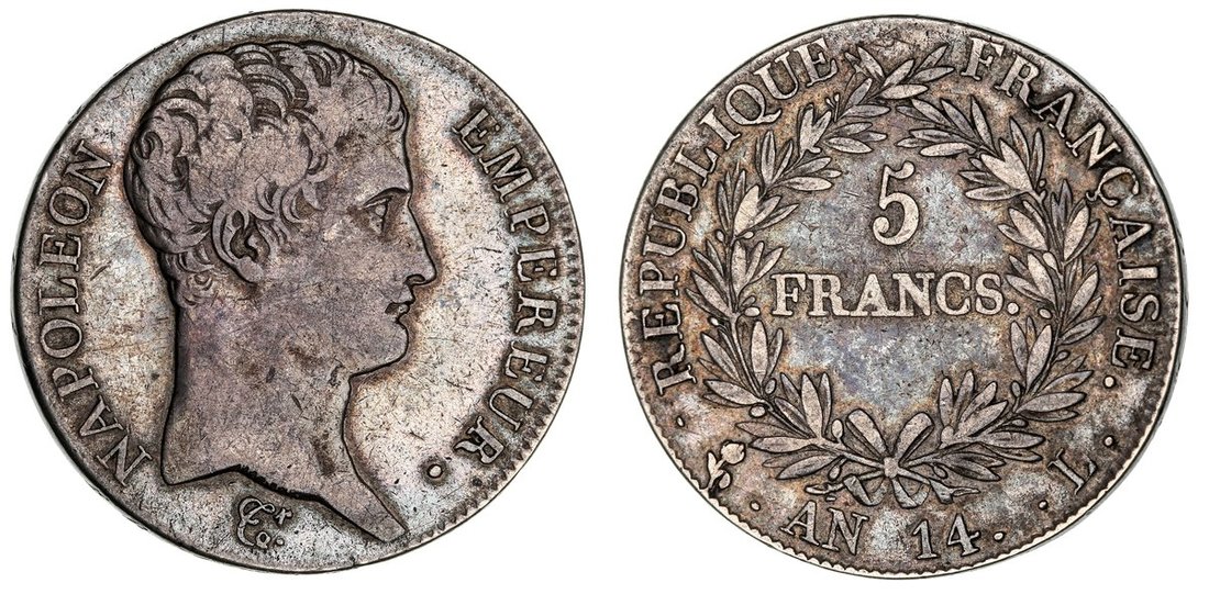 France, First Empire, Napoleon I (1804-1814), 5-Francs, AN 14 L (1805), Bayonne, bare head right, rev. value in wreath, edge incuse lettered upwards, 25.03g, 6h (Gad. 580; KM 662.9), lightly bagmarked and rubbed to hair, yet with flashy toning to fields, good fine