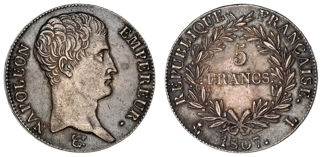 France, First Empire, Napoleon I (1804-1814), 5-Francs, 1807 L, Bayonne, bare head right, rev. value in wreath, edge incuse lettered upwards, 24.94g, 6h (Gad. 581; KM 673.8), rubbed and lightly bagmarked, darkly toned and with lustre to peripheries, good fine