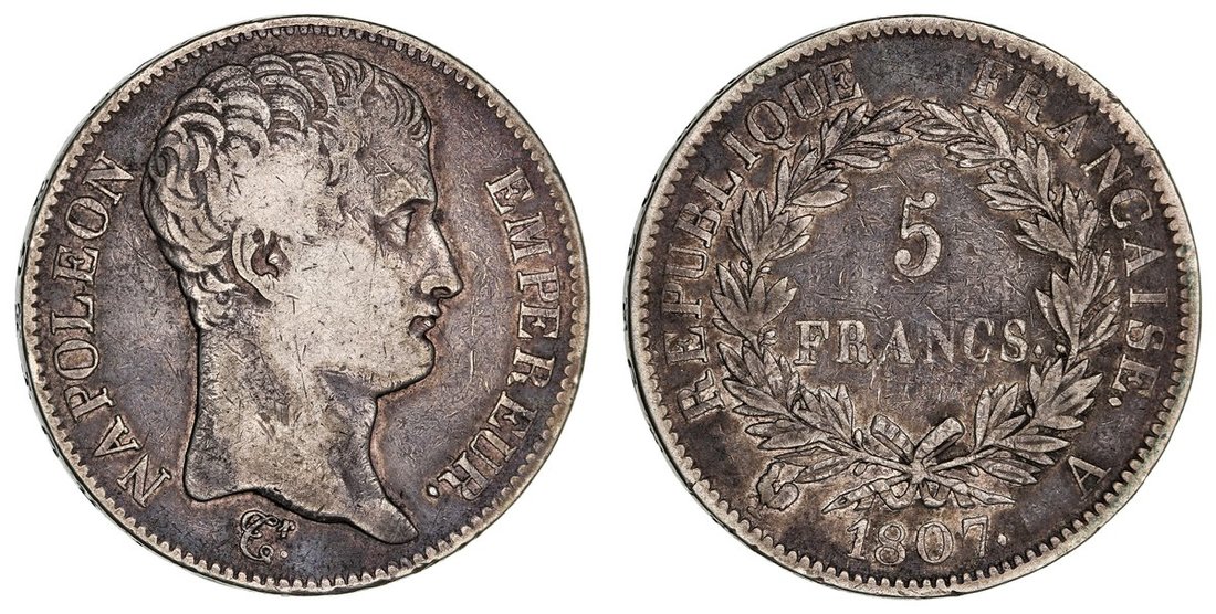France, First Empire, Napoleon I (1804-1814), Transitional Type, 5-Francs, 1807 A, Paris, bare head right, rev. value in wreath, edge incuse lettered downwards, 24.53, 6h (Gad. 582; F. 305/1; KM 685), rubbed and bagmarked, with a light tone to fields, fine a scarce and desirable type