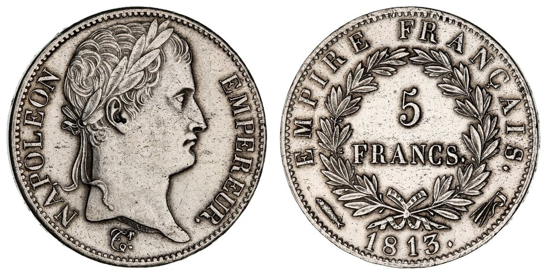 France, First Empire, Napoleon I (1804-1814), 5-Francs, 1813, Utrecht, laureate head right, rev. value in wreath, edge incuse lettered downwards, 24.93, 6h (Gad. 584; KM 694.17), cleaned and bright, very fine