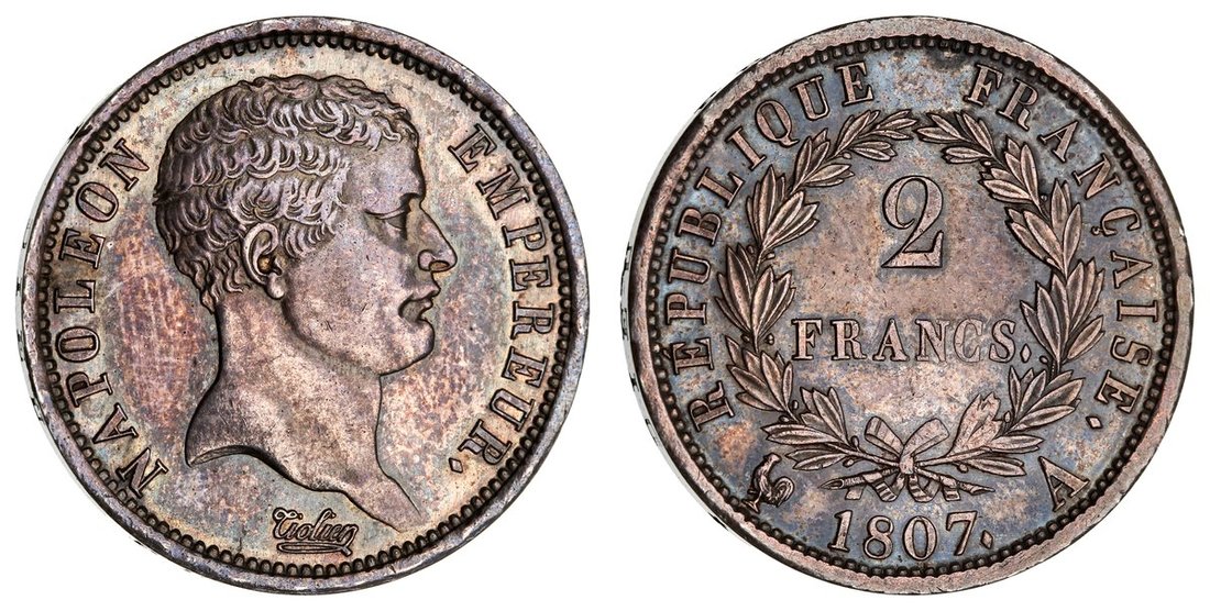 France, First Empire, Napoleon I (1804-1814), 2-Francs, 'African Head', 1807 A, Paris, bare head right, with short hair, rev. value in wreath, edge incuse lettered upwards, 9.92g, 6h (Gad. 499; KM 683.1), some slight irregularity to rim, evidence of previous handling to otherwise richly cabinet toned and glossy fields, touch of rub to hair, otherwise a good very fine example of this rare "short-haired" one-year type