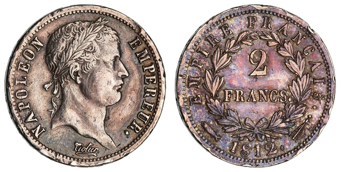 France, First Empire, Napoleon I (1804-1814), 2-Francs, 1812, Utrecht, laureate head right, rev. value in wreath, edge incuse lettered downwards, 9.94g, 6h (Gad. 501; F. 255/50; KM 639.16), wiped and with edge knocks, iridescent toning, near very fine and a scarce type