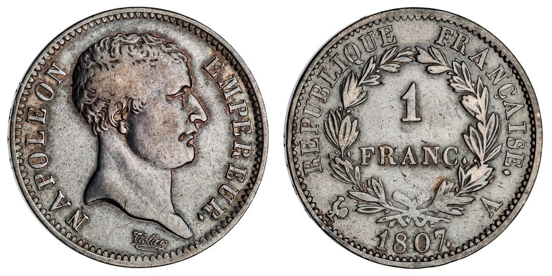 France, First Empire, Napoleon I (1804-1814), 1-Franc, 'African Head', 1807 A, Paris, bare head right, rev. denomination within wreath, dividing mintmarks, year below, edge lettered, 4.95g, 6h (Gad. 445; KM 681.1), cleaned and rubbed, retoned, fine