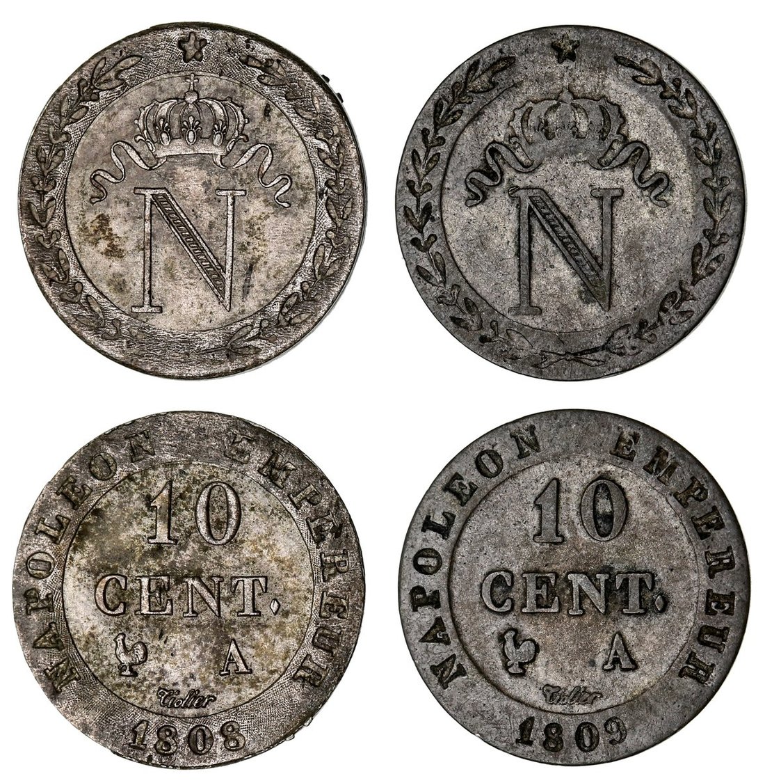 France, First Empire, Napoleon I (1804-1814), 10-Centimes, 1808 A, Paris, crowned N, rev. value, edge plain, 2.02g, 6h (Gad.190; KM 676.1), with a speckled tone and residual lustre, good very fine; 10-Centimes, 1809 A, Paris, as before, edge plain, 2.05g, 6h (Gad. 190; KM 676.1), fine (2)