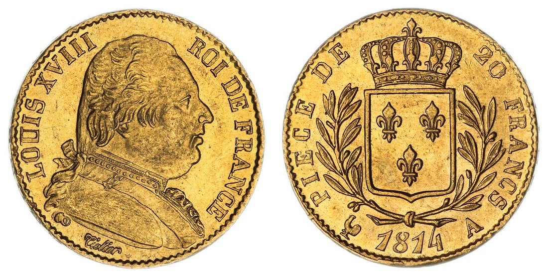 France, Bourbon Restoration, Louis XVIII (1814-1815), Gold 20-Francs, 1814 A, Paris, draped bust right, rev. crowned shield in wreath, edge incuse lettered upwards, 6.45g, 6h (Gad. 1026; KM 706.1; Fb. 525), couple of light contact marks, otherwise with a pleasing mint lustre, extremely fine