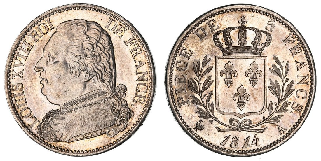 France, Bourbon Restoration, Louis XVIII (1814-1815), Proof 5-Francs, 1814 A, Paris, draped bust left, rev. crowned shield in wreath, edge incuse lettered upwards, 25.01g, 6h (Gad. VG2364; KM 702.1), wispy hairlines and a handful of light contact marks to otherwise glossy-brilliant fields, couple of faint edge bruises, nearing as struck and scarce proof of record