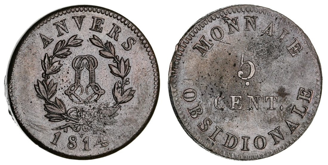 France, Bourbon Restoration, Siege of Antwerp, Louis XVIII (1814-1824), 5-Centimes, 1814 V, Wolschot, cypher within wreath, ANVERS above, date and mintmark below, rev. denomination, edge plain, 14.15g, 6h (Gad. 130c; KM 3; Colaert 17), pitting to flan and lightly irregular toning, otherwise with lustre, very fine and scarce, only 1,000 struck
