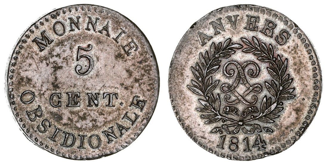 France, Bourbon Restoration, Siege of Antwerp, Louis XVIII (1814-1824), 5-Centimes, 1814, Naval Arsenal, cypher within wreath, ANVERS above, date below, rev. denomination, edge plain, 15.44g, 12h (Gad. 131a; KM 4; Colaert 27), well-struck in medal alignment, only minor scuffs, good very fine