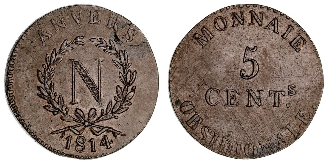 France, First Empire, Siege of Antwerp, Napoleon I (1804-1814), 'Large Flan' 5-Centimes, struck on 10-Centime Flan, 1814 V, Wolschot, N within wreath, Anvers above, date below, rev. denomination, edge plain, 14.75g, 6h (Gad. 128; KM 2; Colaert 1), with flan adjustment marks and a pitted flan flaw to obverse by S, as typical of this type, with a pleasing light brown tone, good very fine, a great rarity with a mintage of only 180