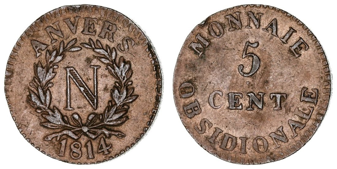 France, First Empire, Siege of Antwerp, Napoleon I (1804-1814), 5-Centimes, 1814 V, Wolschot, N within wreath, Anvers above, date below, rev. denomination, edge plain, 12.72g, 6h (Gad. 129a; KM 2; Colaert 9), two small edge knocks and soft to tops of devices, light brown tone, about very fine