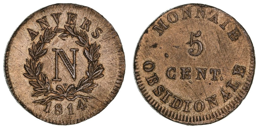 France, First Empire, Siege of Antwerp, Napoleon I (1804-1814), 5-Centimes, 1814 V, Wolschot, N and mintmark within wreath, Anvers above, date below, rev. denomination, edge plain, 12.13g, 6h (Gad. 129b; KM 2; Colaert 10), adjustment marks to flan, light brown tone, good very fine