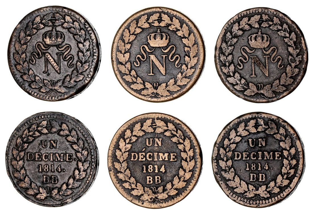 France, Siege of Strasbourg, Napoleon I (20 March - 8 July 1815), First Blockade of Strasbourg, 1-Decime, 1814 BB, Strasbourg, stop after DECIME and date, crowned N in wreath, rev. value and date in wreath, stop after both, edge plain, 22.72g, 6h (Gad. 195; F.131/3), heavily pitted to edge and some bruising, about very fine; 1-Decime, 1814 BB, Strasbourg, stop after date, much as before, edge plain, 20.48g, 6h (Gad. 195; F.131/4), good fine; 1-Decime, 1814 BB, Strasbourg, no stops, as before, edge plain, 21.15g, 6h (Gad. 195; F.131/1), good fine (3)