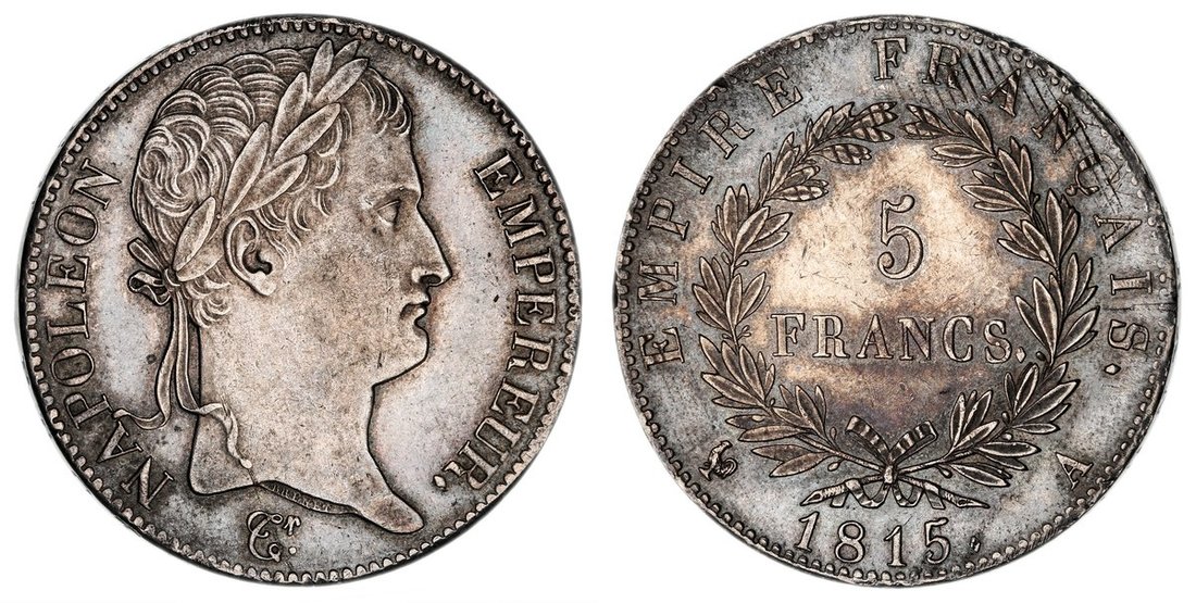 France, Napoleon I, Hundred Days (March-June 1815), 5-Francs, 1815 A, Paris, laureate bust right, rev. value in wreath, edge incuse lettered upwards, 24.97g, 6h (Gad. 595; KM 704.1), light scattering of contact marks and adjustment marks to reverse, with a flashy lustre to blue toned surfaces, extremely fine and a scarce one-year of issue type