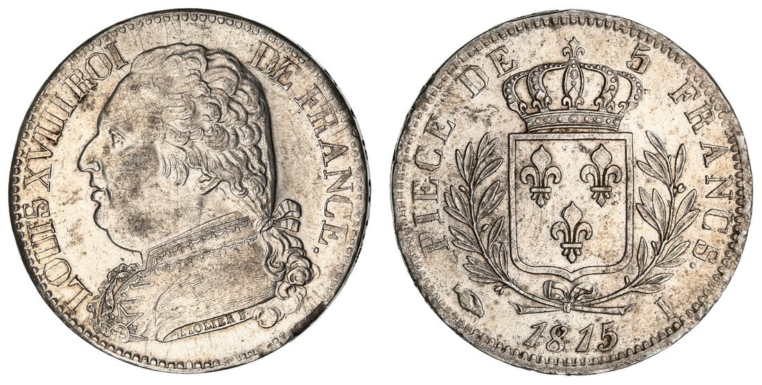 France, Bourbon Restoration, Louis XVIII (1815-1824), Proof 5-Francs, 1815 I, Limoges, draped bust left, rev. crowned shield in wreath, edge incuse lettered upwards, 24.78g, 6h (Gad. 591; KM 702.6), light contact marking and bruising to edge, lustrous, bolder very fine
