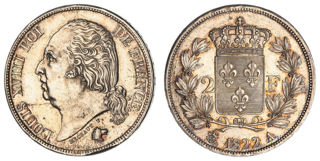 France, Bourbon Restoration, Louis XVIII (1815-1824), 2-Francs, 1822 A, Paris, bare bust left, rev. crowned shield in wreath, edge incuse lettered downwards, 9.99g, 6h (Gad. 513; KM 710.1), obverse struck from lightly rusted die and with edge bruising around 6 o'clock, otherwise lustrous and toned in parts, nearing extremely fine