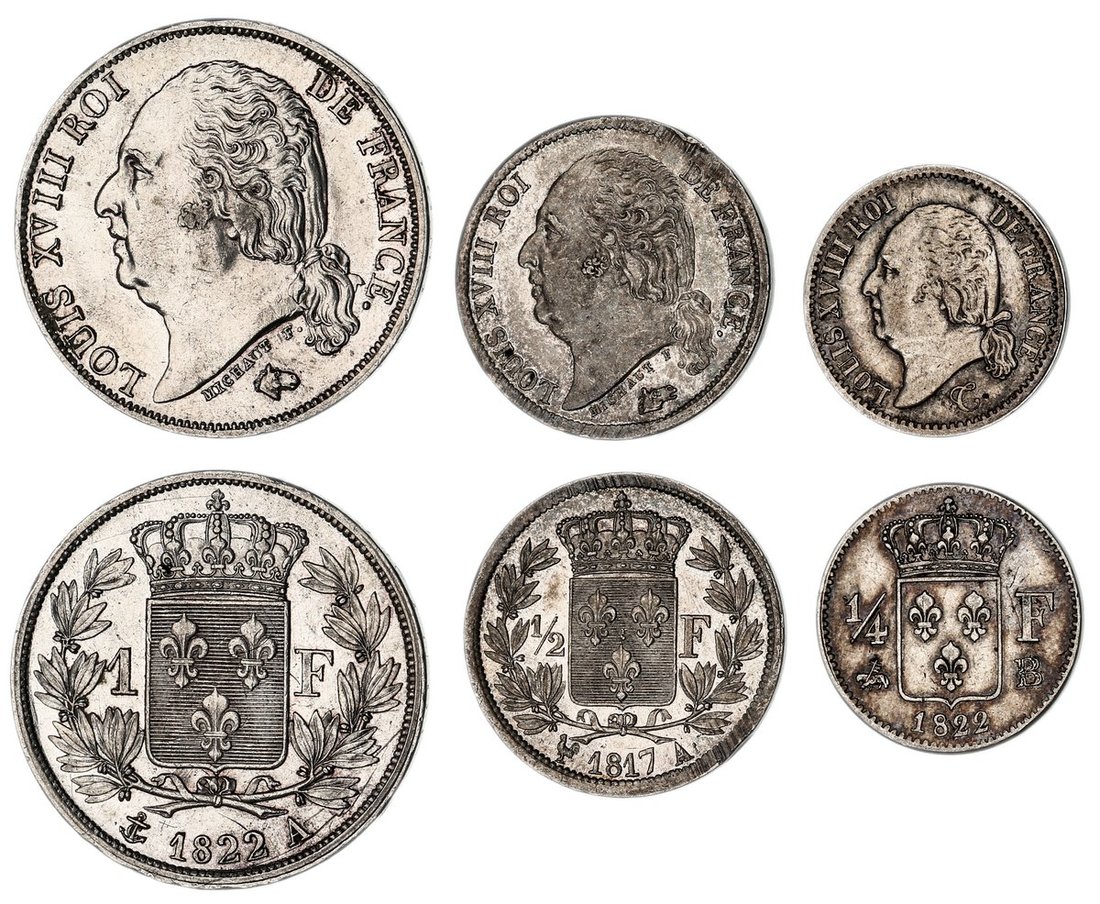 France, Bourbon Restoration, Louis XVIII (1815-1824), 1-Franc, 1822 A, Paris, bare bust left, rev. crowned shield in wreath, edge incuse lettered downwards, 4.95g, 6h (Gad. 449; KM 709.1), cleaned, bolder very fine; Half-Franc, 1817 A, Paris, much as before, edge plain, 2.49g, 6h (Gad. 401; KM 708.1), edge bruise and with some adjustment marks to reverse, otherwise with a minty lustre, extremely fine; Quarter-Franc, 1822 B, Rouen, much as before, edge plain, 1.23g, 6h (Gad. 352; KM 678.2), touch of rub to devices, toned, very fine (3)