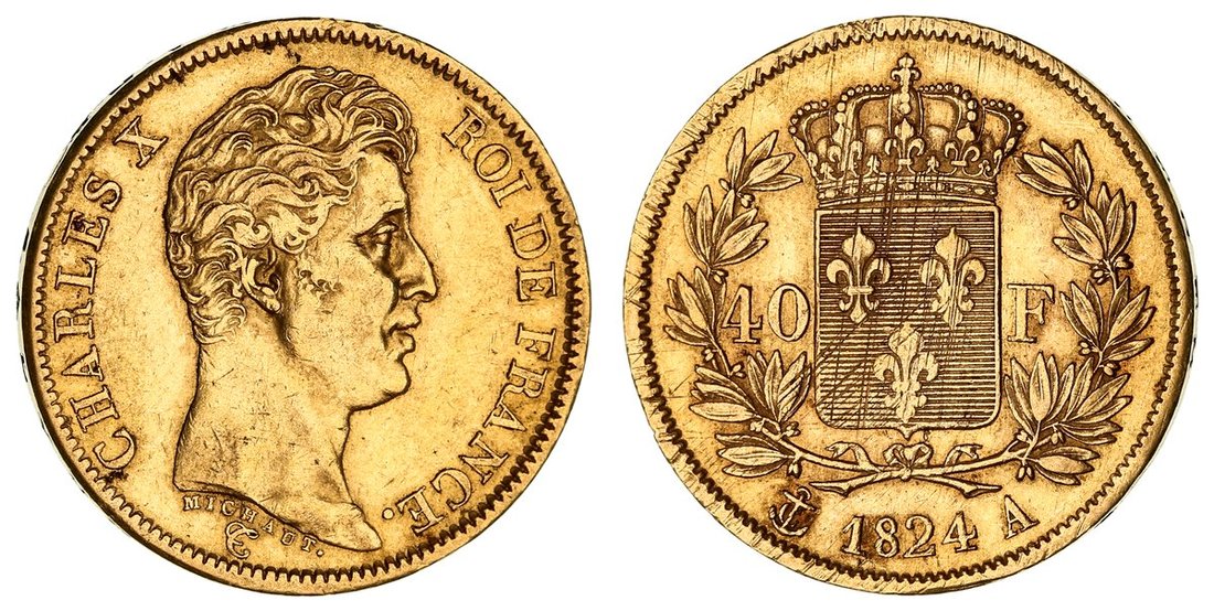 France, Bourbon Restoration, Charles X (1824-1830), Gold 40-Francs, 1824 A, Paris, Type I, bare head right, rev. crowned shield in wreath, edge incuse lettered upwards, 12.86g, 6h (Gad. 1105; KM 721.1; Fb. 547), wiped and lightly bagmarked, adjustment marks to reverse, with a red hue, very fine, one of only 50,000 struck